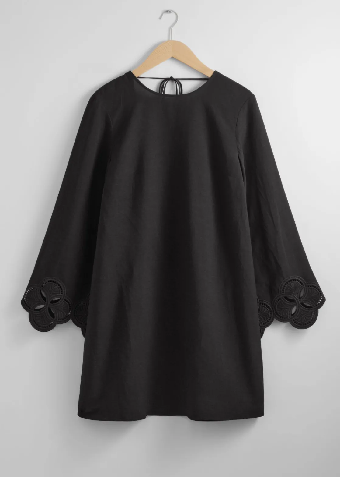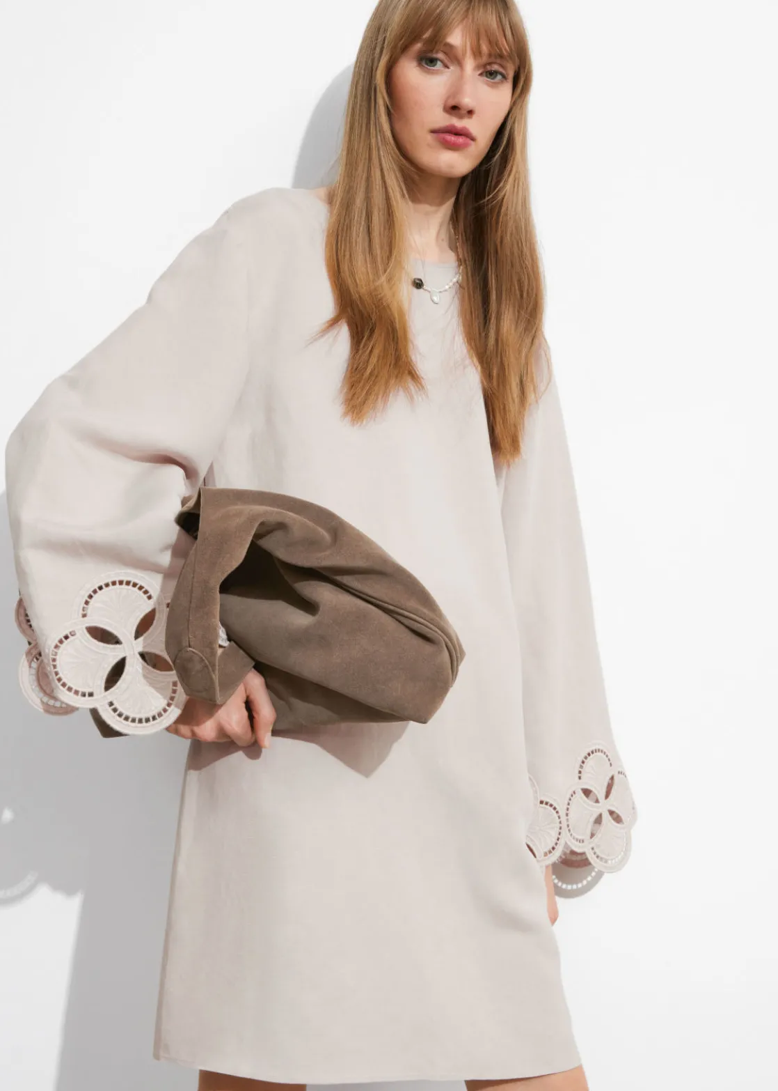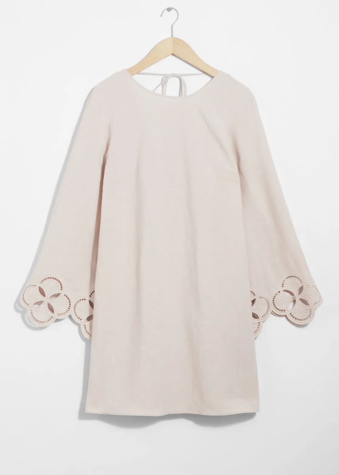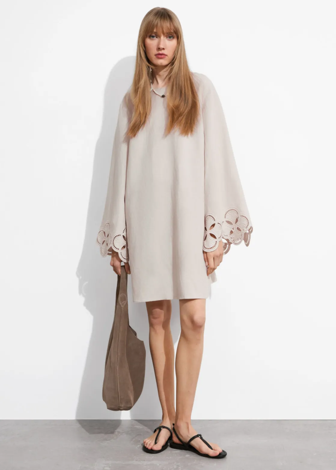 A-line mini dress made from a breezy material. Featuring long, wide sleeves finished with embroidered embellishments at the cuffs.