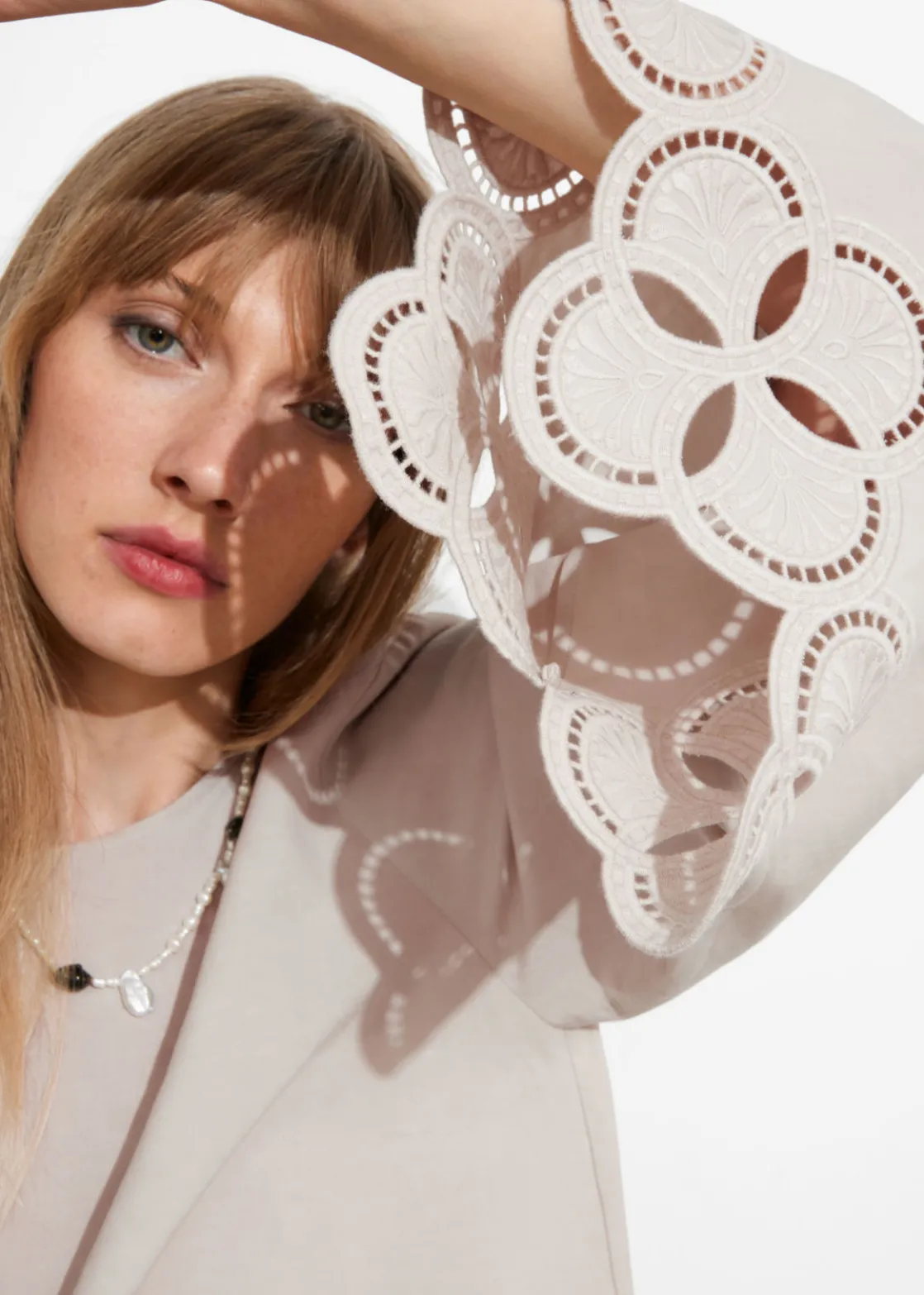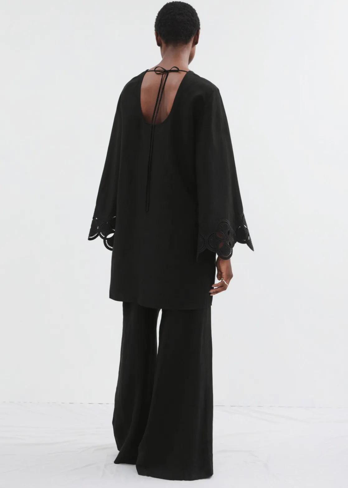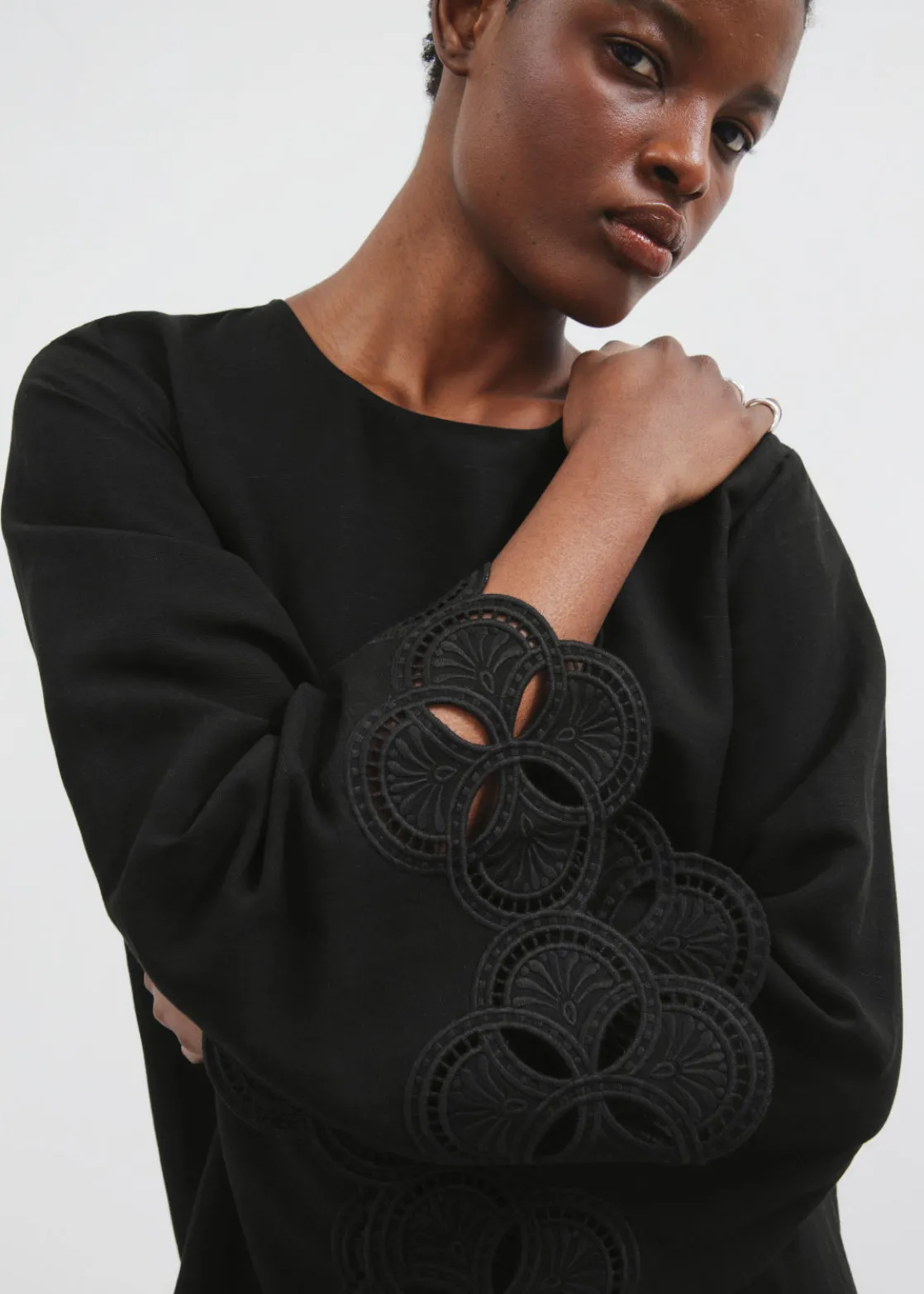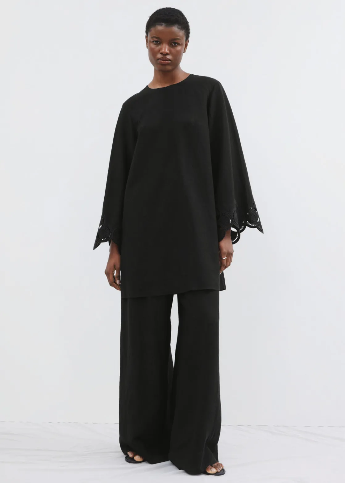 A-line mini dress made from a breezy material. Featuring long, wide sleeves finished with embroidered embellishments at the cuffs.