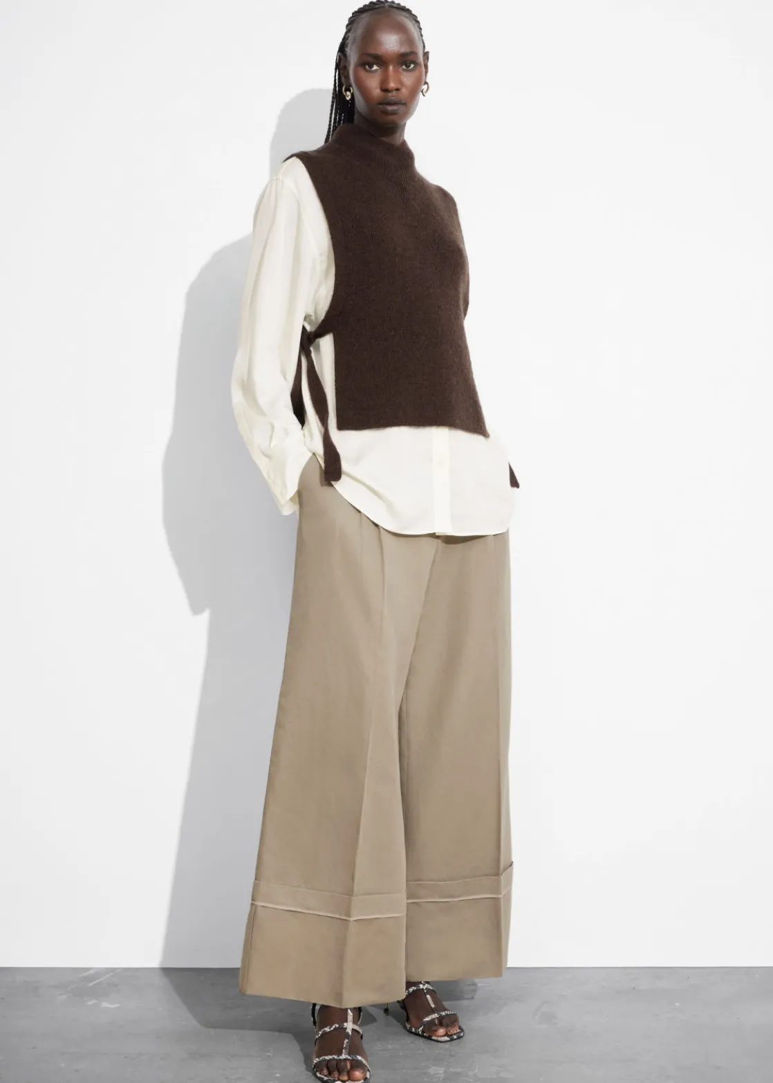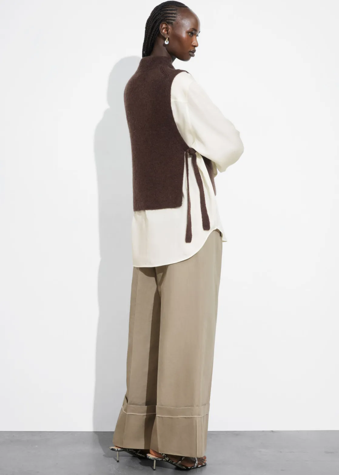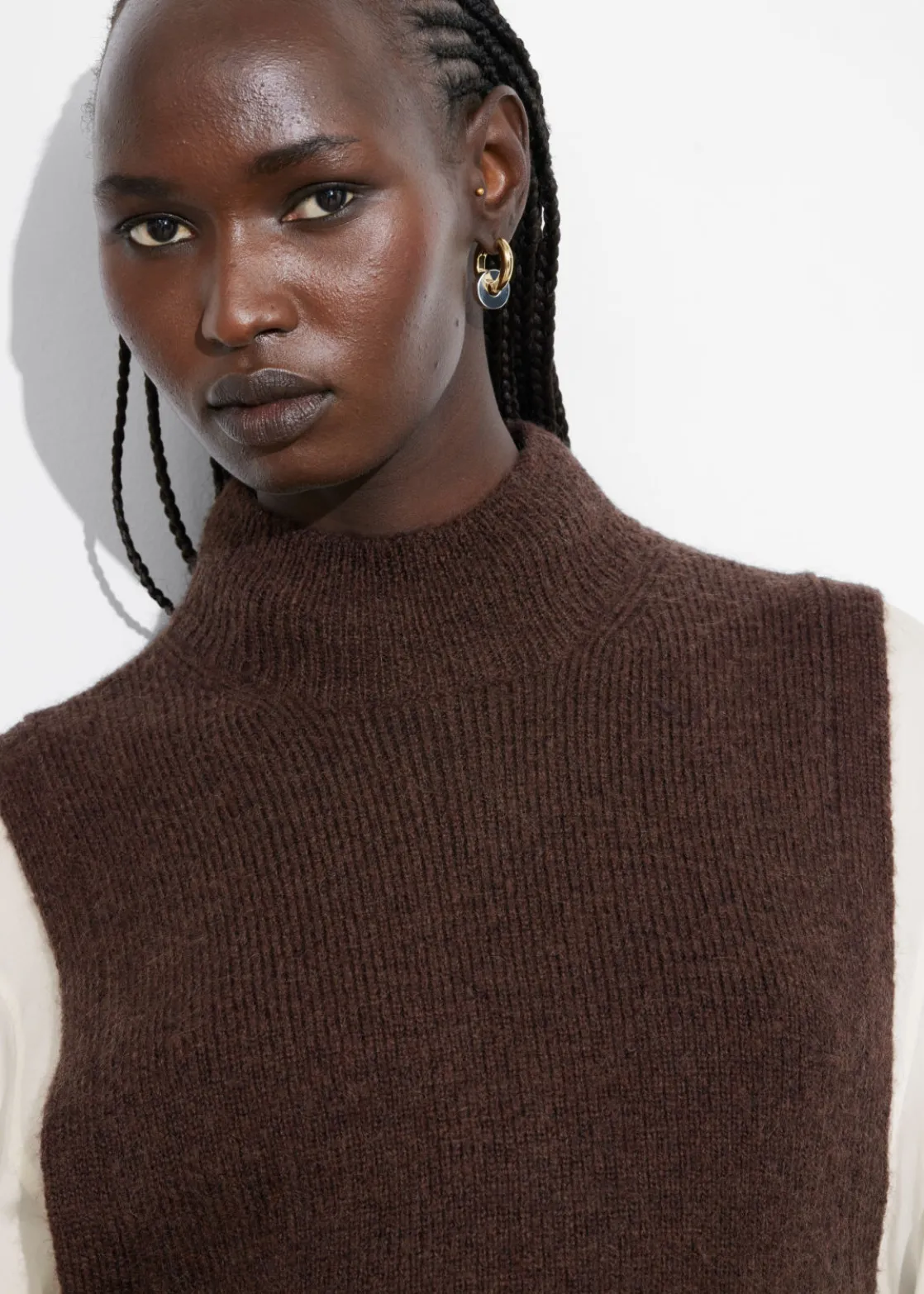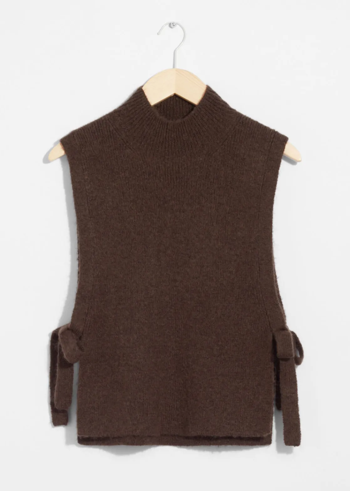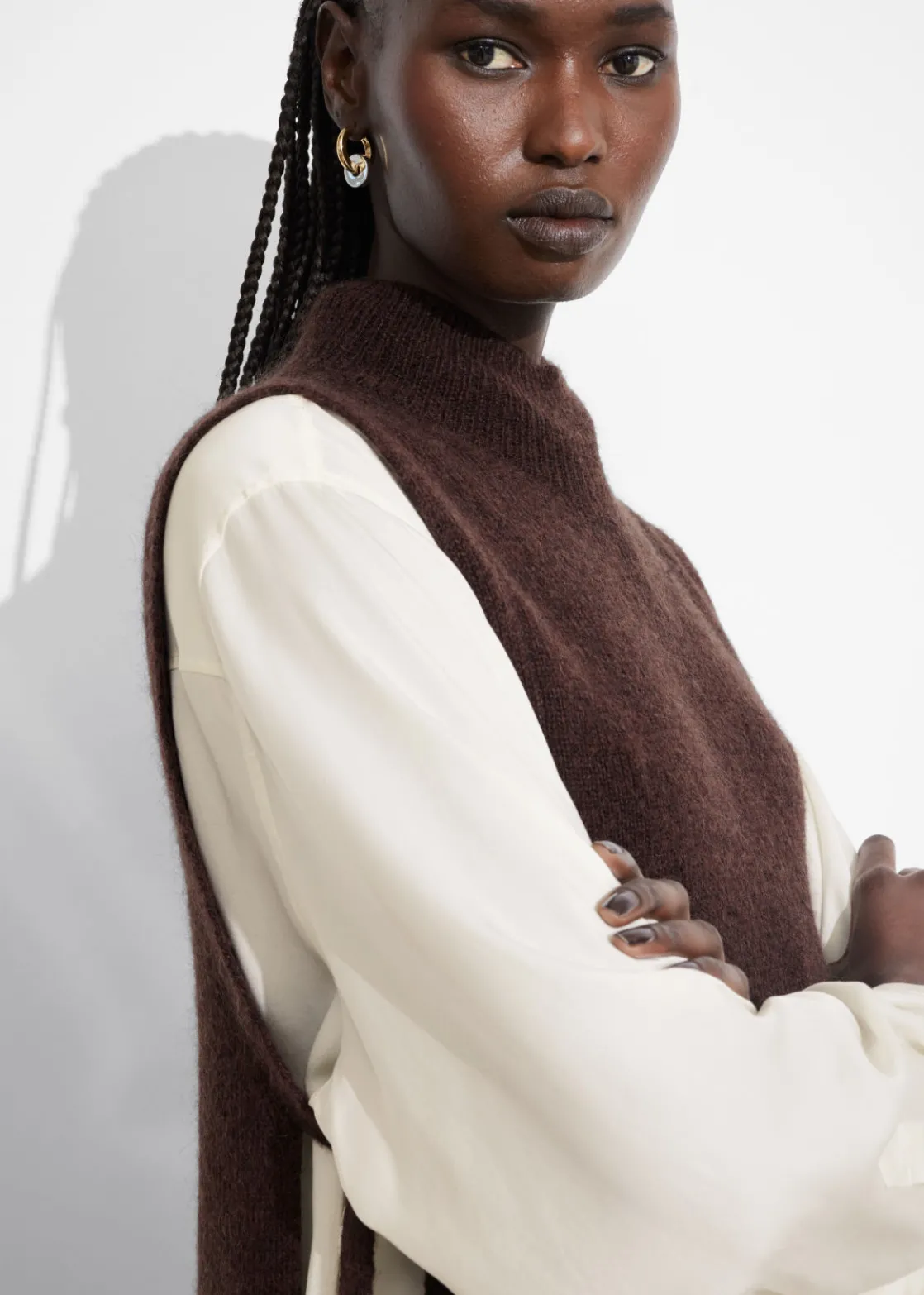 Mock neck bib collar knitted from wool and mohair. Detailed with ties at the sides.