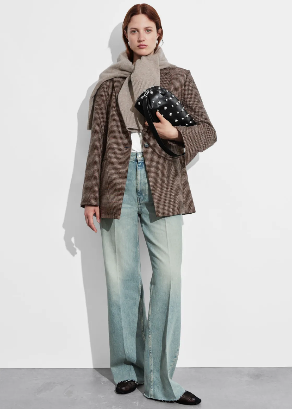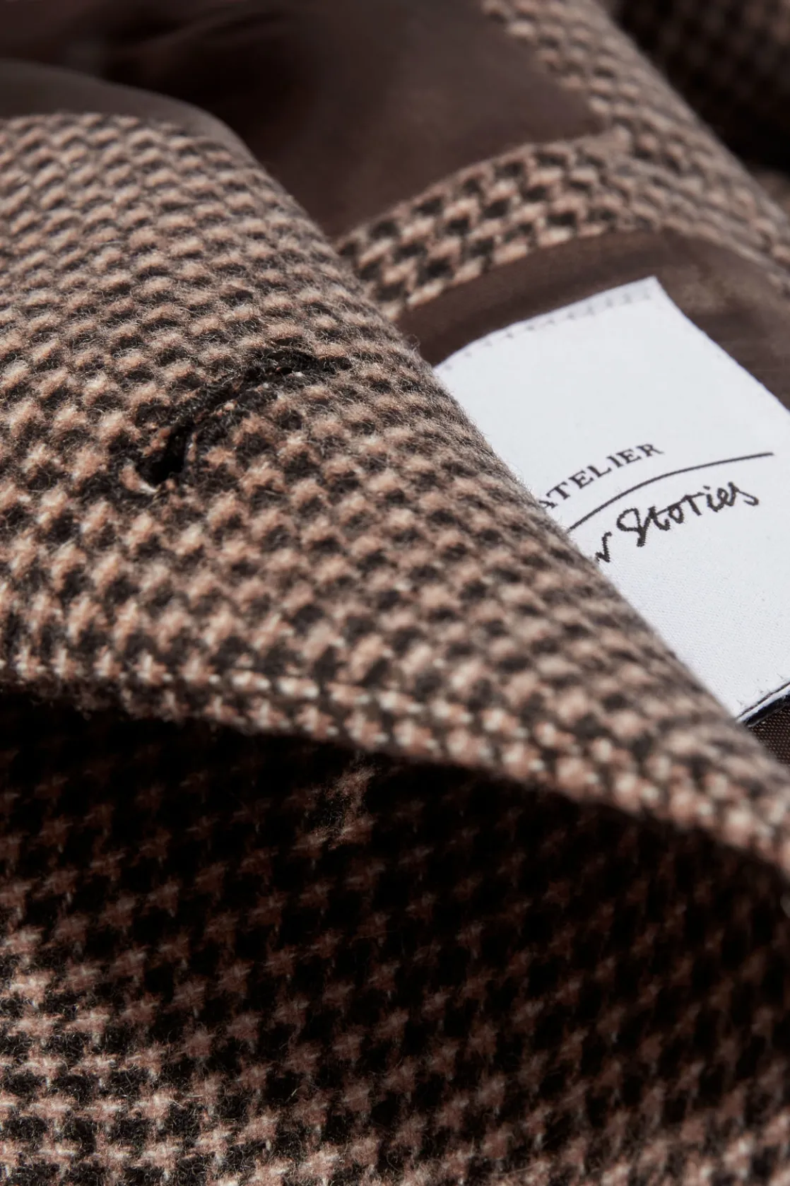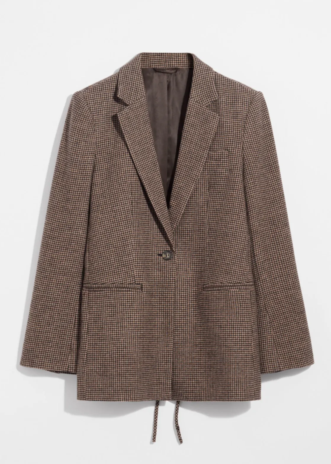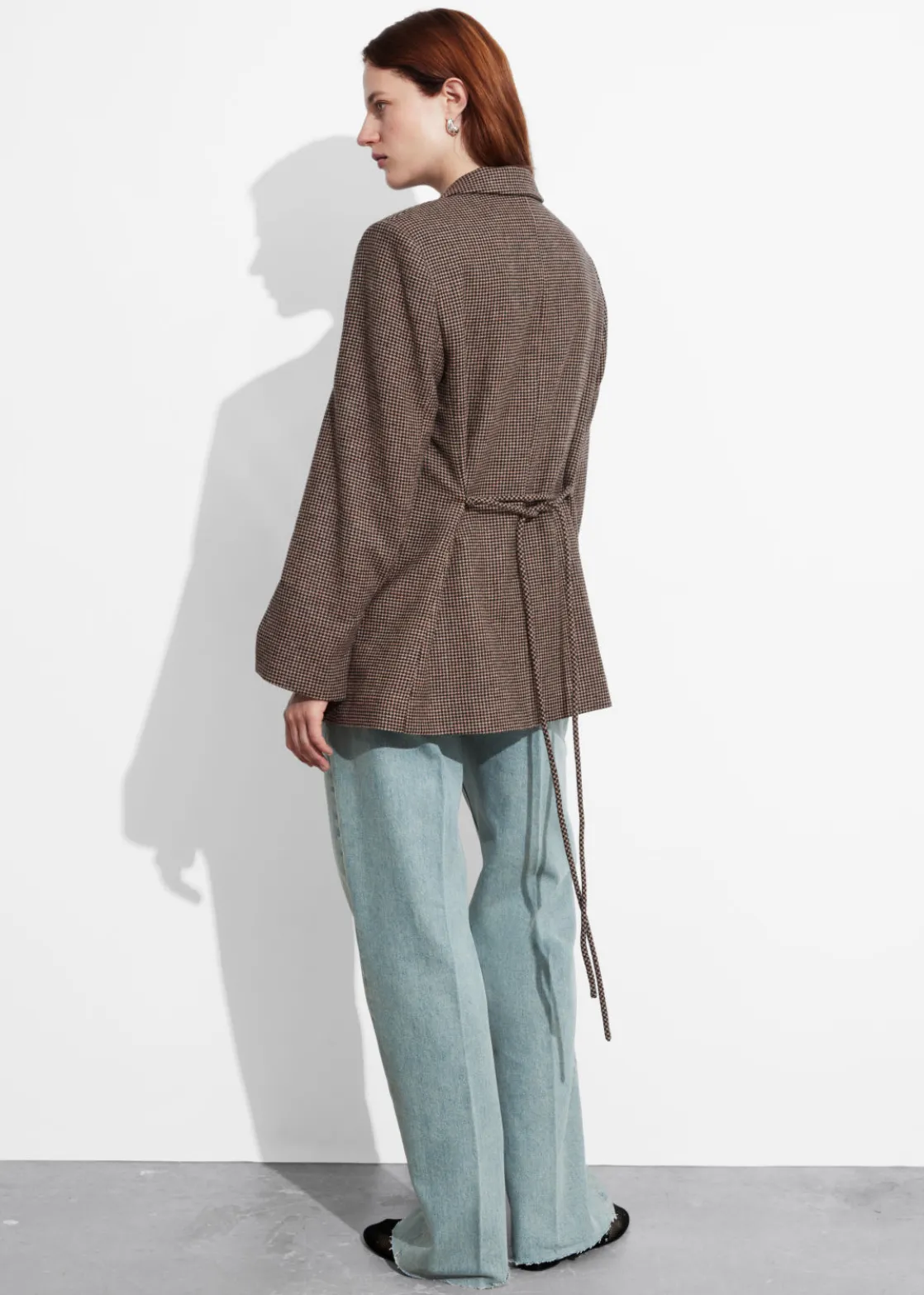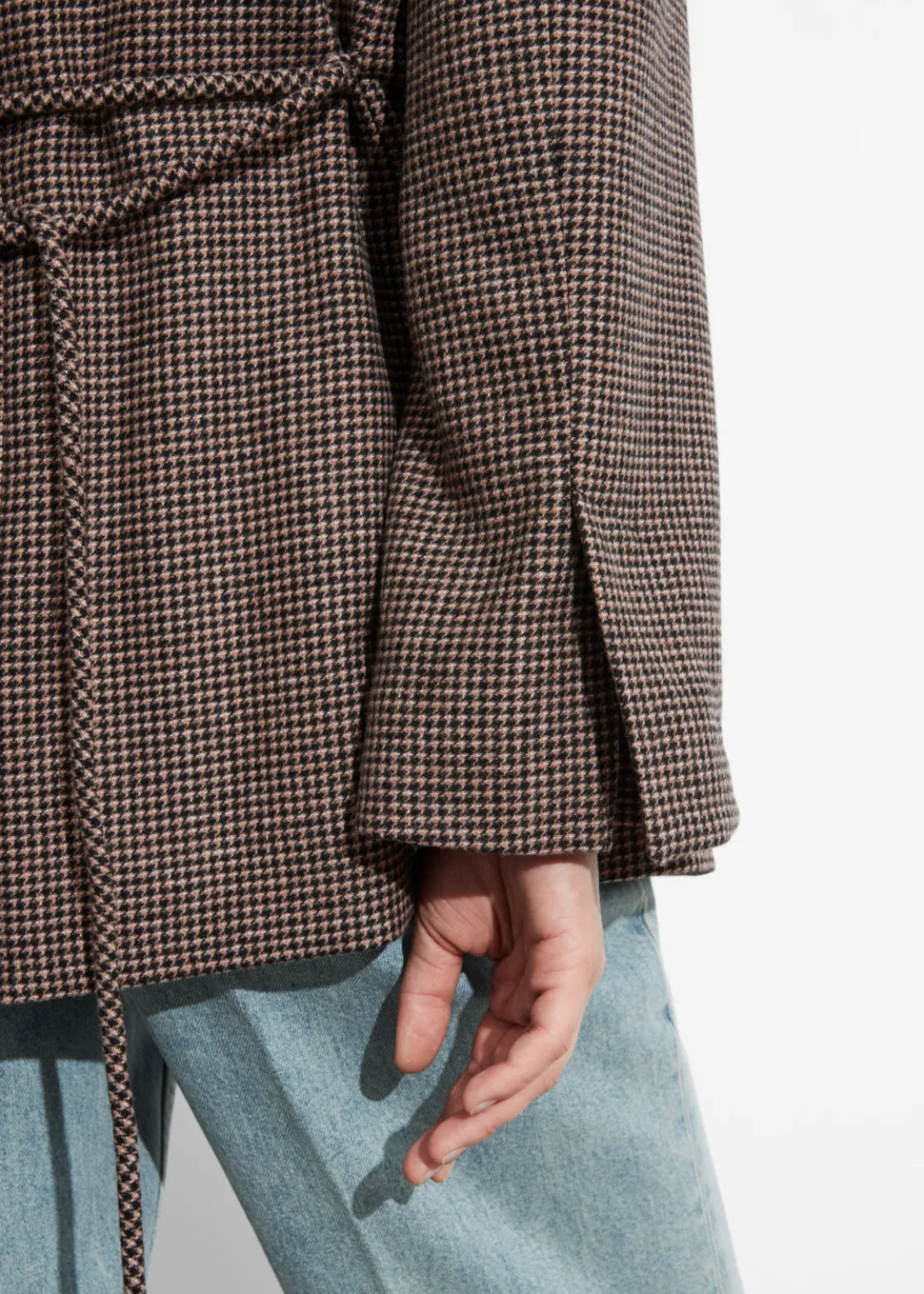 Single-breasted blazer crafted from a wool blend. Designed with a thin belt.