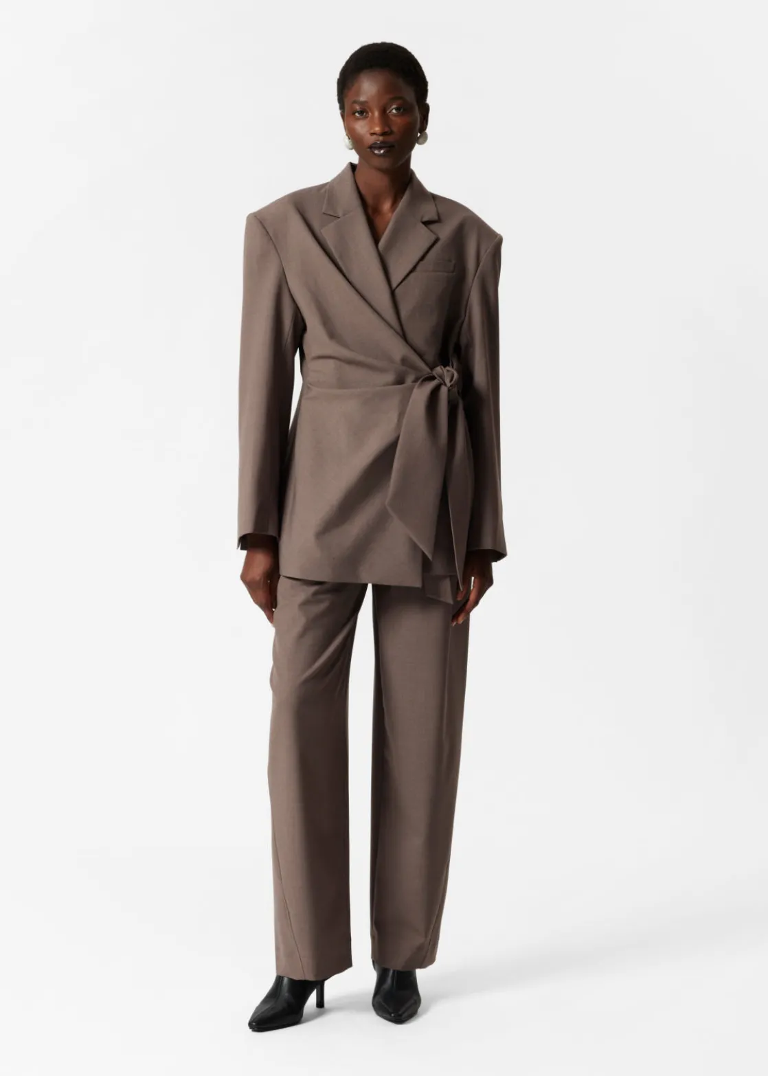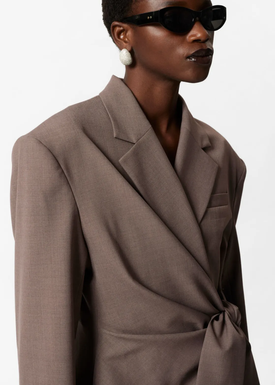 Wool-blend blazer featuring a gently draped wrap lapel secured with a tie at the side.